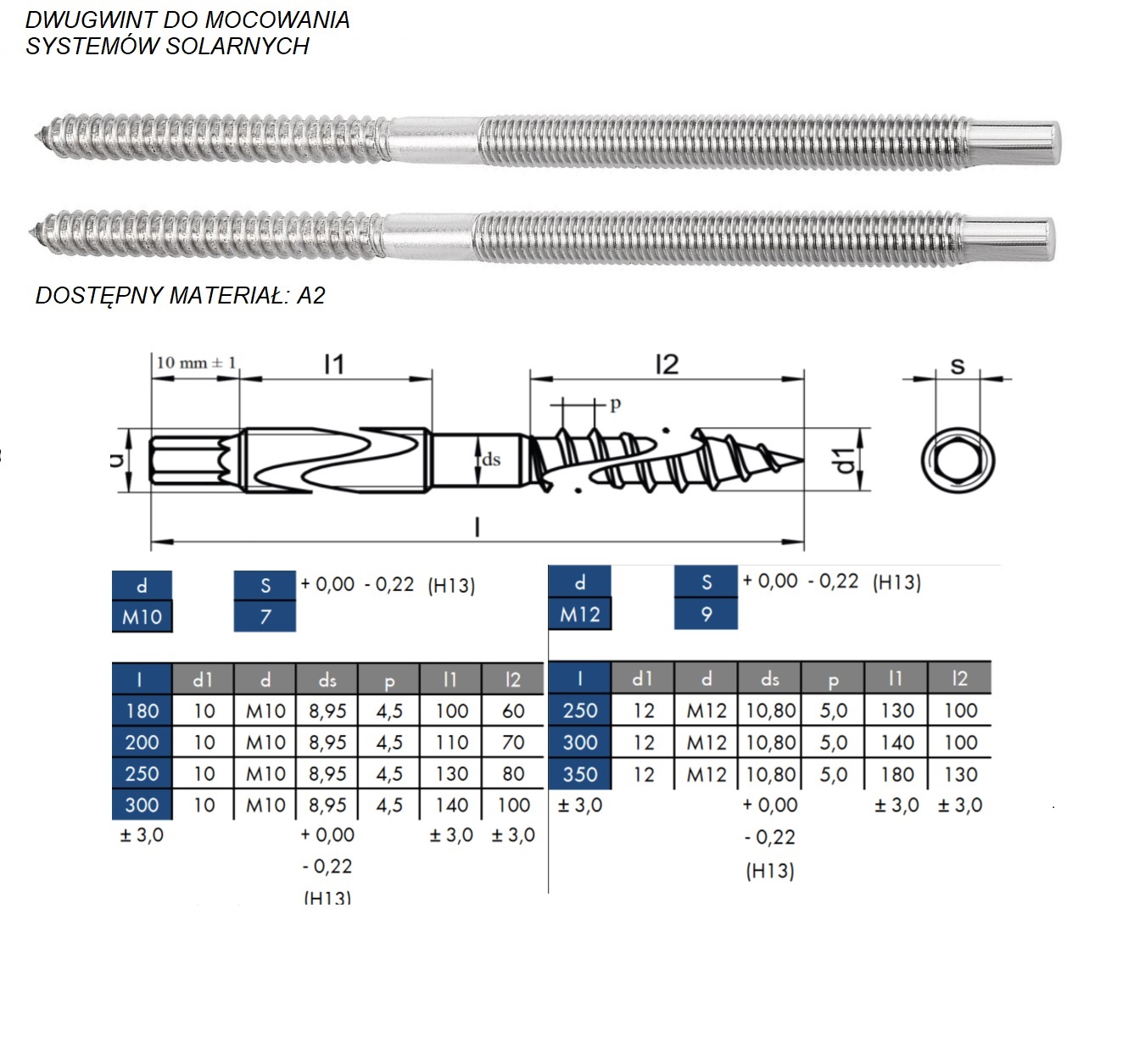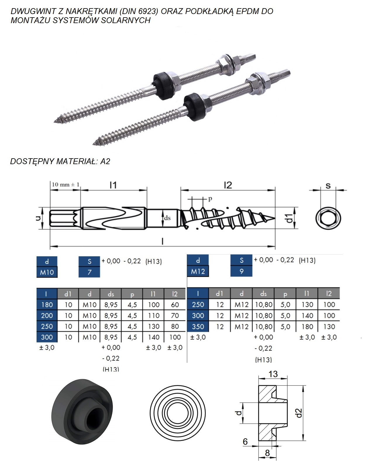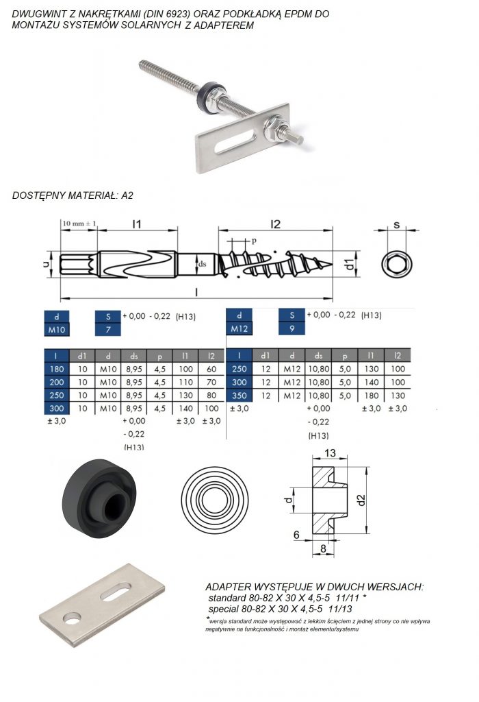 Dobra śruba dwugwintowa wykonana jest z bardzo wytrzymałej stali nierdzewnej. Powinna wyróżniać się, podobnie jak przewody solarne, znakomitą odpornością na oddziaływanie czynników atmosferycznych, takich jak wysokie temperatury, mrozy, porywiste wiatry czy wilgoć. W zależności od typu, dwugwinty mogą być uzupełniane nakrętkami, podkładkami EPDM lub adapterami. Ważny jest odpowiedni dobór tych części. Na przykład – w przypadku dachów pokrytych blachodachówką należy przewiercić otwór umożliwiający przytwierdzenie konstrukcji do krokwi. Do tego rozwiązania potrzebny jest wkręt dwugwintowy z podkładką EPDM, zapewniającą odpowiednią szczelność w miejscu łączenia. Śruba bez podkładki może przepuszczać wilgoć do wnętrza domu. Jeśli brakuje jakichkolwiek elementów złącznych w zestawie dwugwintów M8, M10 lub M12, w naszej firmie błyskawicznie znajdą Państwo idealnie dopasowane części.