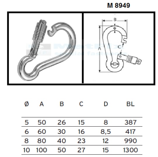 Karabińczyk kwasoodporny z zebezp. (mateiał AISI 316, A4) M 8949