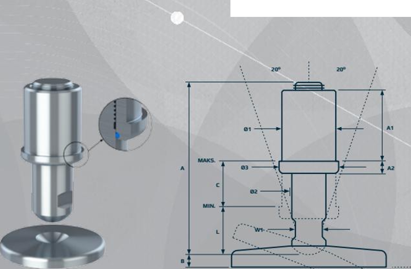 Stopka KTSBX-AS składa się z podstawy, śruby podporowej i złącza spawalniczego stanowiących osobne elementy, śruba podporowa utrzymuje swoją pozycję dzięki osiowo symetrycznemu zagłębieniu w podstawie.